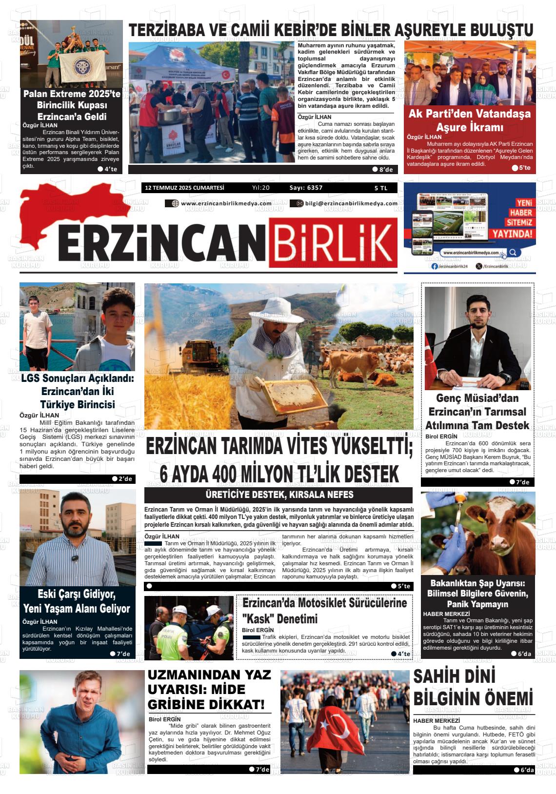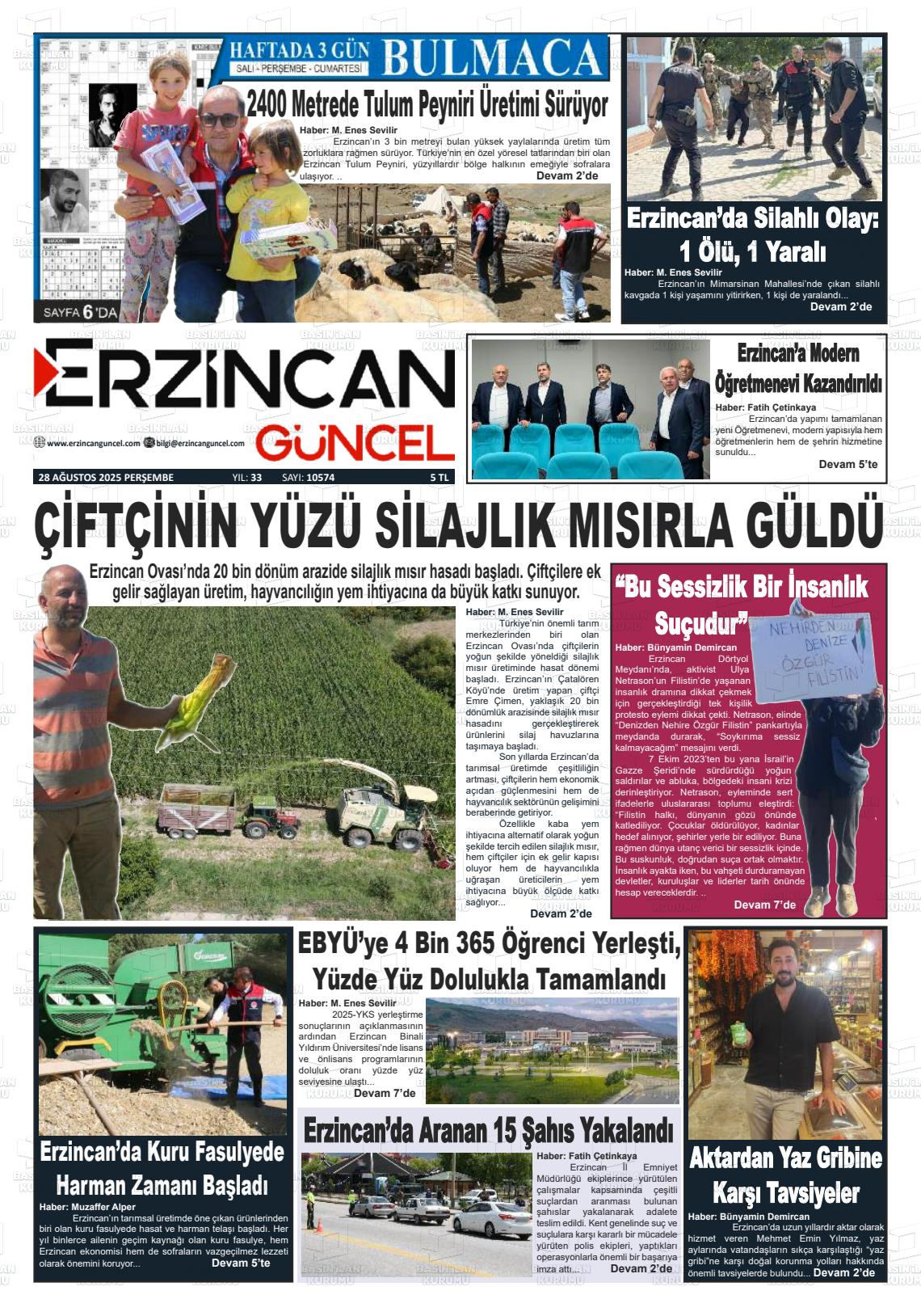 Erzİncan Yerel Gazeteleri 23 Ekim 2025, Perşembe Günü Manşeti